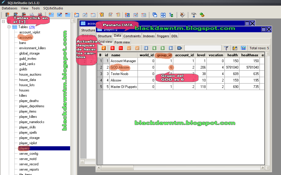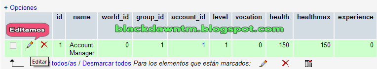 En la imagen vemos que GOD Alissow pertenece al grupo 6 mientras que las demas al grupo 1 que son cuentas normales, este paso de cambiar el group ID lo tenemos que hacer en la tabla de accounts como en la de players.
