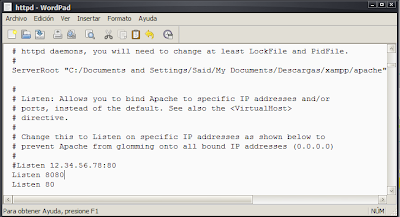 Como aparece en la imagen buscamos Listen 80, y arriba de eso vamos a poner el puerto que queramos, en este caso vamos a usar el puerto 8080, lo escribimos arriba del que viene por defecto. Al hacer esto tenemos que abrir el puerto 8080. Lo podemos hacer desde el firewall de windows. Y con esto nuestra nueva direccion para nuestra web seria algo como http://xxx.xx.xxx.xxx:8080.